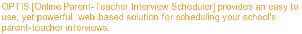 Craig White Principal Mount Pearl Intermediate Using OPTIS since 2003 | | | What is OPTIS? | The Online Parent Teacher Interview Scheduler allows parents to book interview times with teachers online, any time, from anywhere. In minutes a convenient schedule can be made. No more busy phone lines, no more long waits.